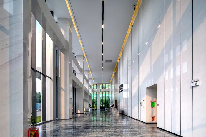 大堂作為企業(yè)最重要也是給客戶第一印象的空間,更應(yīng)該是具有強(qiáng)烈的企業(yè)獨(dú)特性。宏電大廈在大堂的設(shè)計(jì)上摒棄了傳統(tǒng)的方式,化繁為簡(jiǎn),采用低碳綠色、高端簡(jiǎn)約的設(shè)計(jì)理念,兼顧設(shè)計(jì)美學(xué)和可持續(xù)綠色的原則,采用超高空間、超大采光的立面裝飾,使大堂全天最大限度的接收自然光線的照射,為空間帶來純粹的視覺震撼。立柱和墻面選用白色大氣的環(huán)保石材,與地面平整光滑的深色搭配,一深一淺,勾勒出大廈整體低碳科技的主題色。